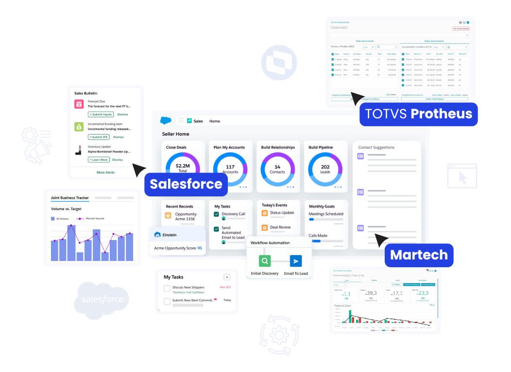 CRM (Salesforce), ERP (Protheus e outros produtos TOTVS como RM, Fluig e PIMS) e canais digitais em um fluxo contínuo.