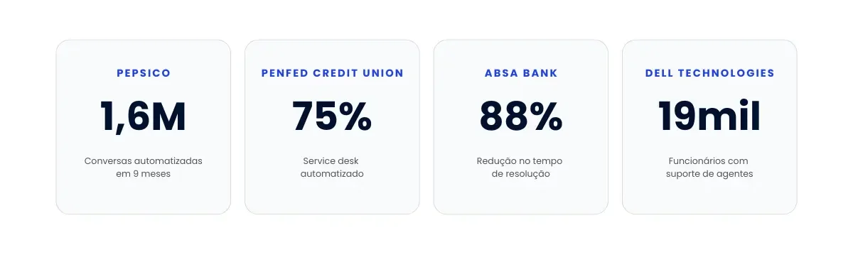 PenFed Credit Union: Automatizou 75% do service desk e economiza $3 milhões por ano. Os agentes humanos agora focam em casos complexos e construção de relacionamento.