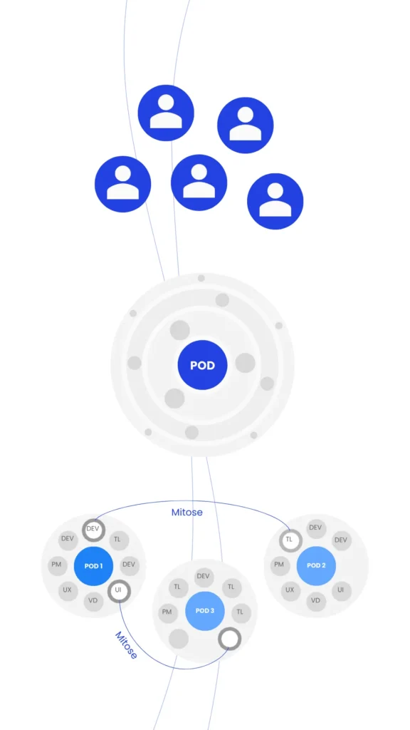 Equipes multidisciplinares, auto-organizadas e com foco em metas de negócio, resultado e inovação.