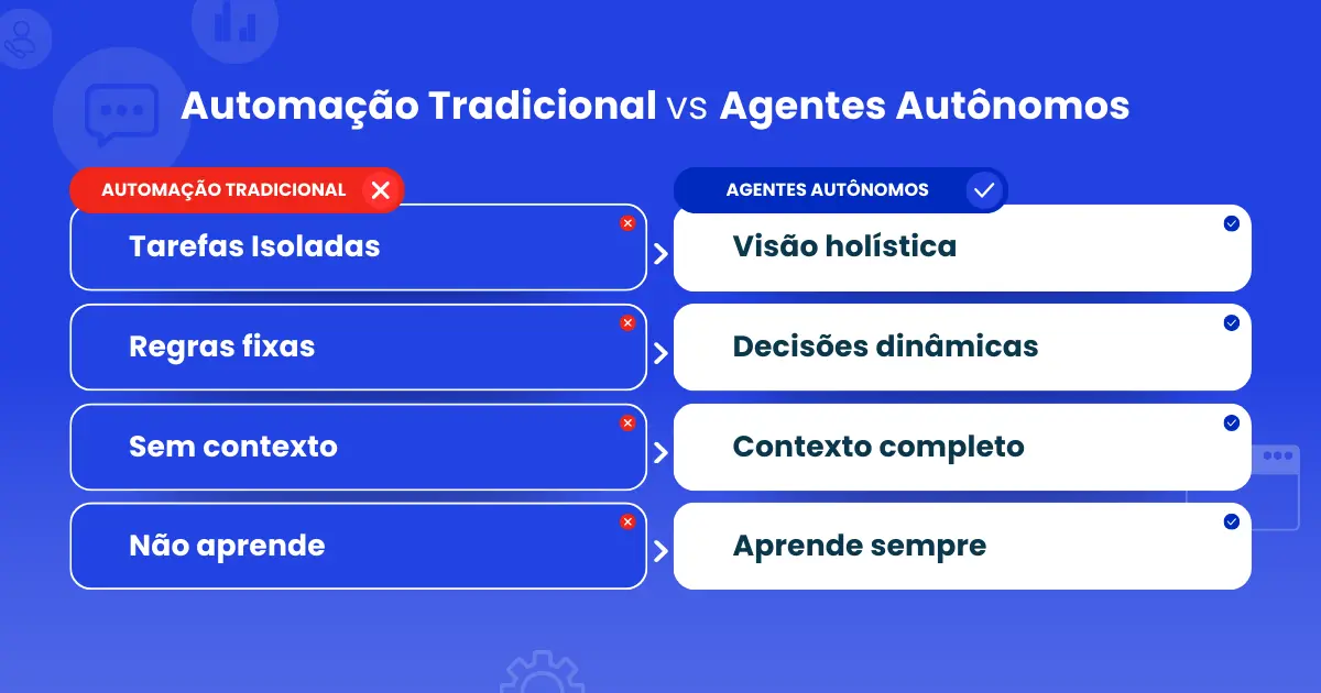 - Entende contexto completo: Não apenas responde, mas compreende histórico, preferências, regras de negócio e objetivos organizacionais