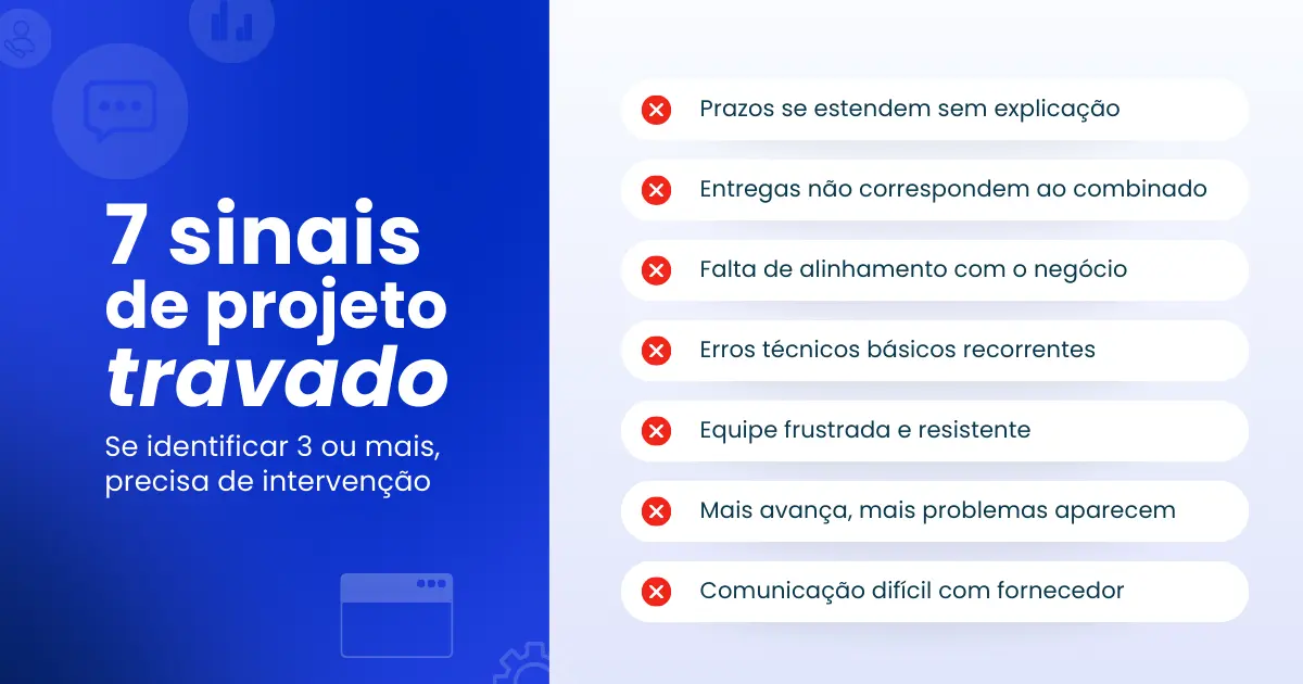 Antes de falar das soluções, vale reconhecer os sintomas. Se você identificar três ou mais desses sinais, seu projeto provavelmente precisa de uma intervenção: