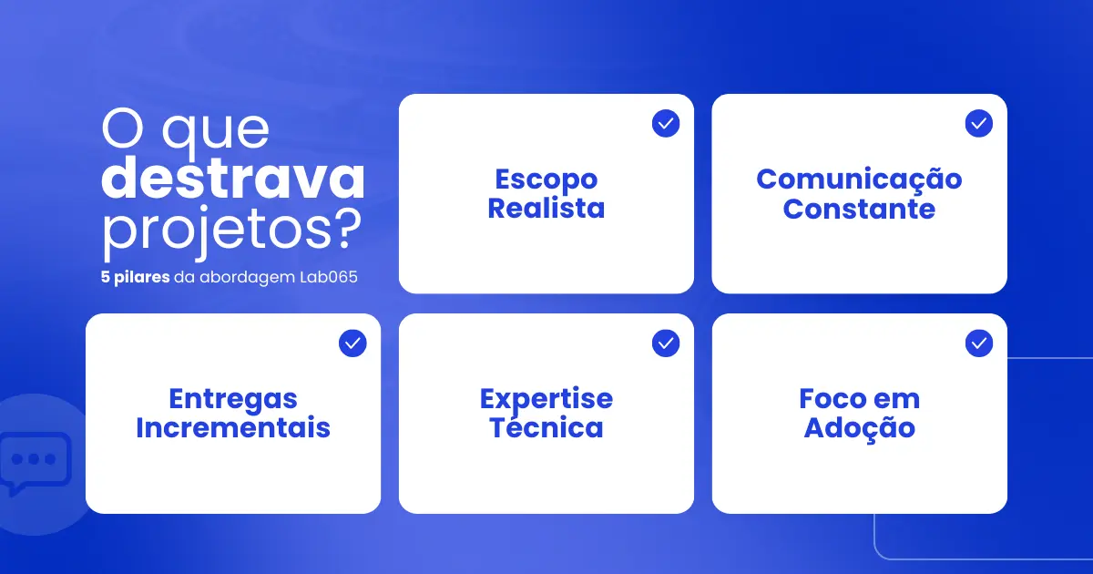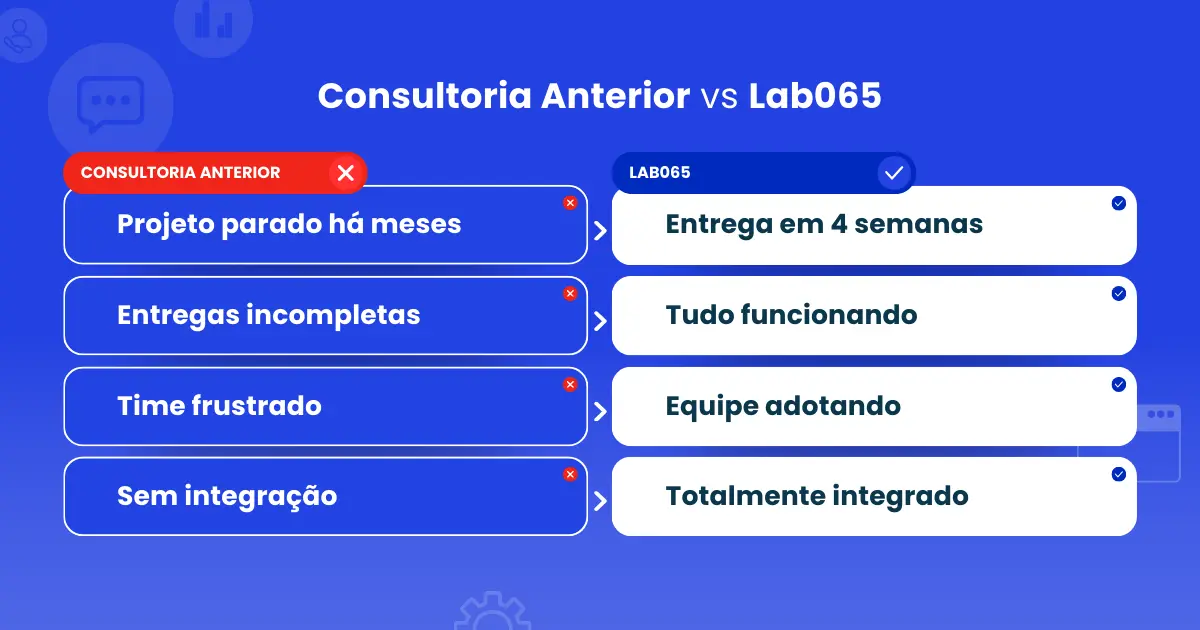 A Lab065 tem histórico comprovado em assumir projetos complexos e entregar resultados em prazos curtos. Nosso time já destravou dezenas de implementações, sempre com foco em resolver o problema de forma definitiva.